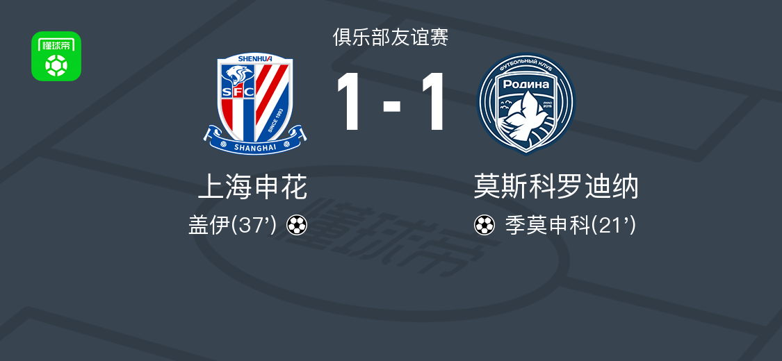 北京时间1月26日俱乐部友谊赛,上海申花对阵莫斯科罗迪纳。莫斯科罗迪纳的季莫申科率先破门,随后陈晋一角球助攻,盖伊头球破门。最终比分上海申花1-1莫斯科罗迪纳。