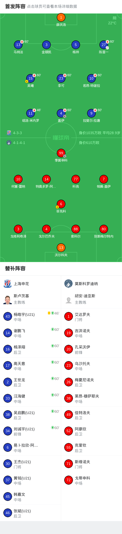 第21分钟,季莫申科率先得分,申花0-1落后莫斯科罗迪纳
